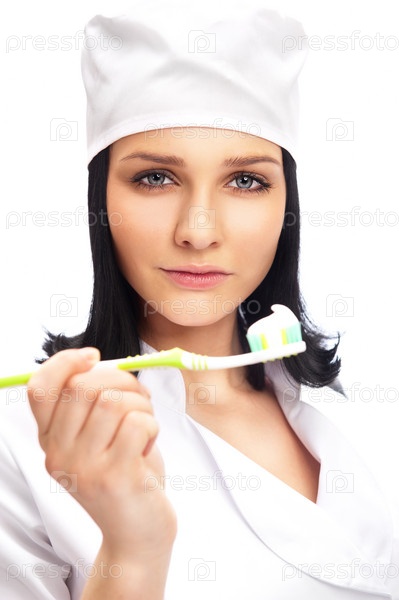 Стоматолог с зубной щеткой, изолировано на белом фоне