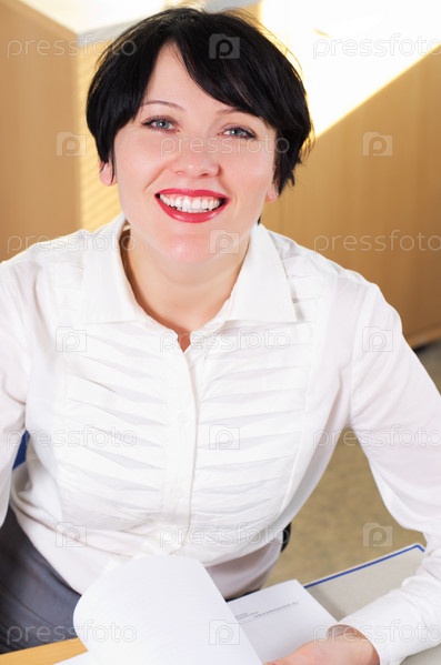 Деловая брюнетка сидит за рабочим столом и улыбается