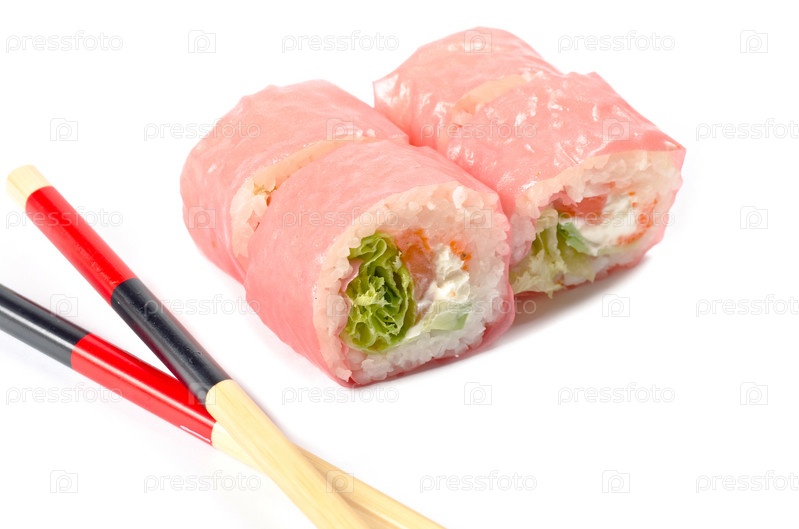 Суши и палочки на белом фоне
