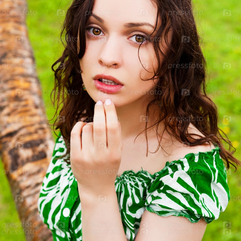 Красивая девушка стоит под дождем в летнем парке