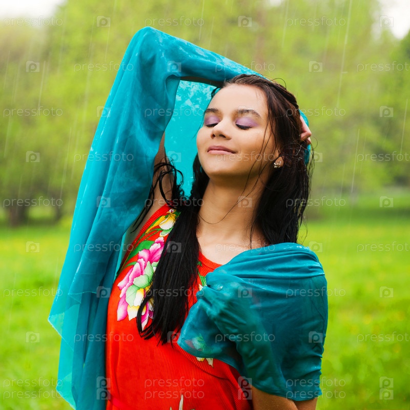 Девушка наслаждается летним дождем в парке