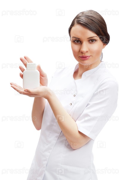 Молодая женщина-врач держит белую бутылочку с новым медицинским средством, белый фон