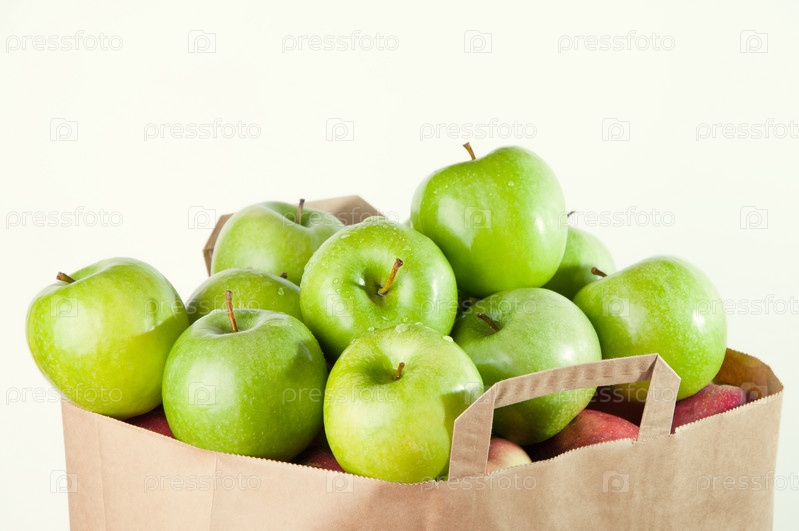 Зеленые яблоки в бумажном бакалейном пакете