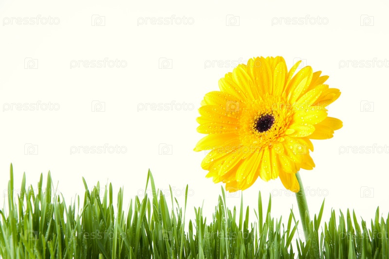 Желтая гербера и зеленая трава на белом фоне