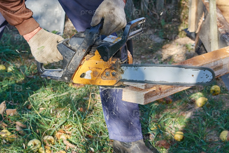 Мужчина распиливает деревянный брус