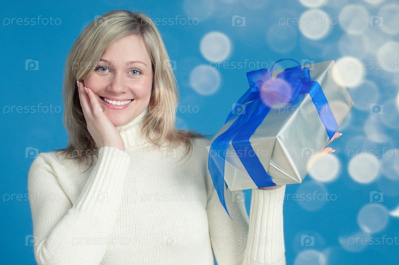 Улыбающаяся светловолосая женщина с подарком в руках