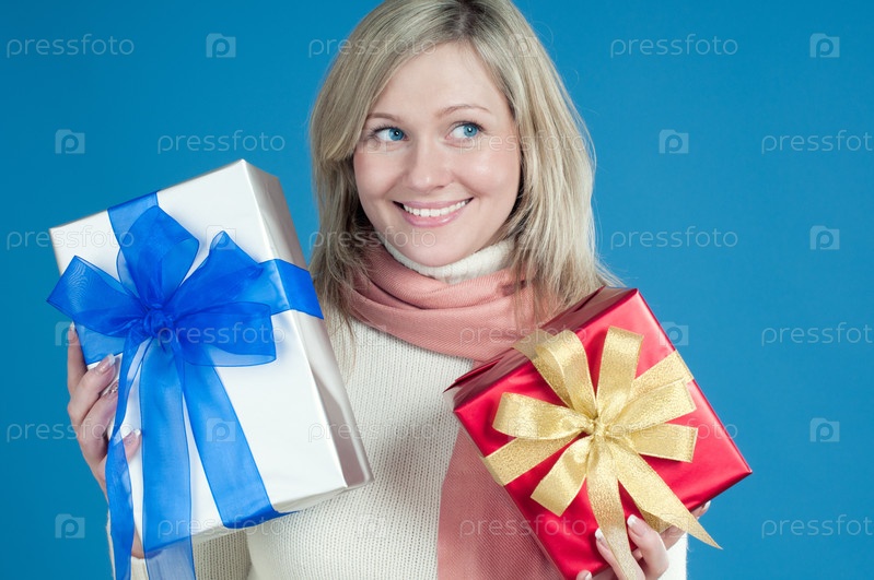 Улыбающаяся молодая блондинка с подарками в руках, синий фон