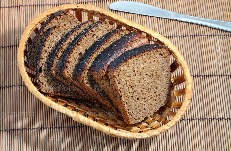 Нарезанный хлеб с семенами тмина в плетеной корзинке и нож на бамбуковой салфетке