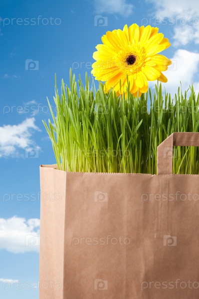 Пакет для покупок с зеленой травой и желтой герберой на фоне неба