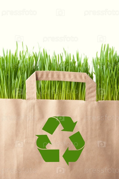 Концепция повторной переработки: бумажный пакет с зеленой травой