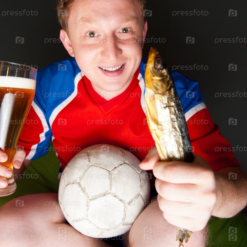 Мужчина смотрит футбол со стаканом пива и вяленой рыбой
