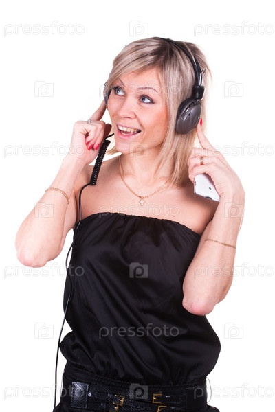 Молодая красивая женщина слушает музыку в наушниках