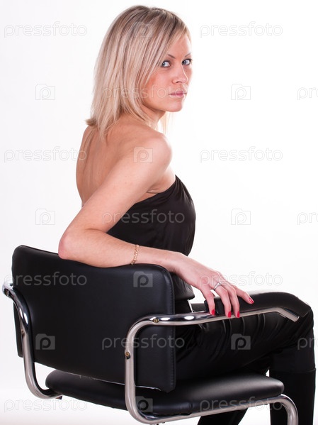 Молодая красивая женщина на стуле на белом фоне