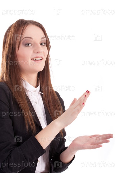 Молодая красивая женщина аплодирует на белом фоне