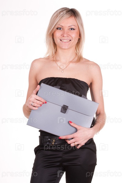 Девушка с кейсом на белом фоне