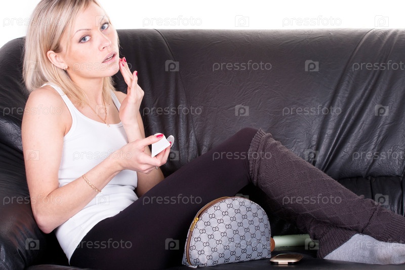 Молодая красивая женщина делает макияж на диване