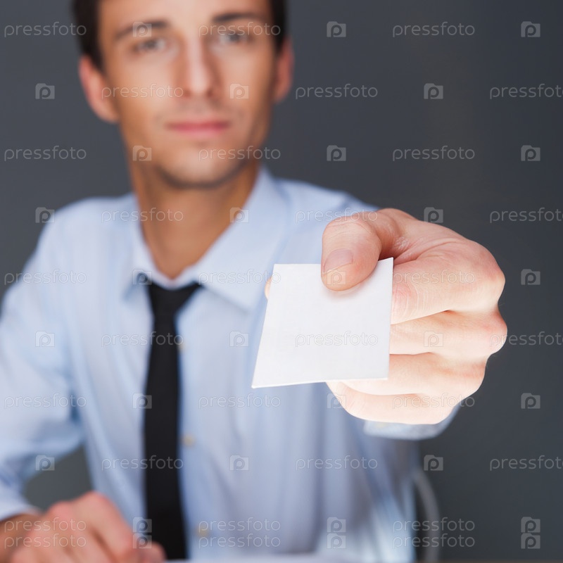 Деловой человек протягивает в руке пустую визитную карточку на сером фоне
