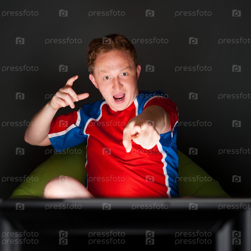 Возбужденный мужчина смотрит футбольный матч по телевизору в темноте