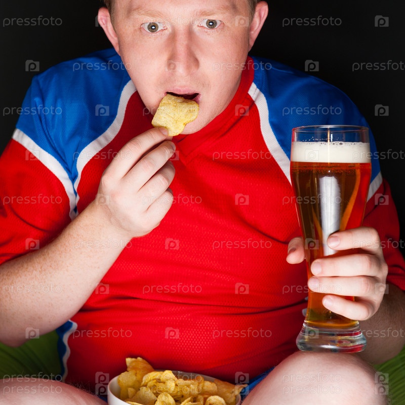 Мужчина смотрит футбольный матч по телевизору, пьет пиво и ест чипсы