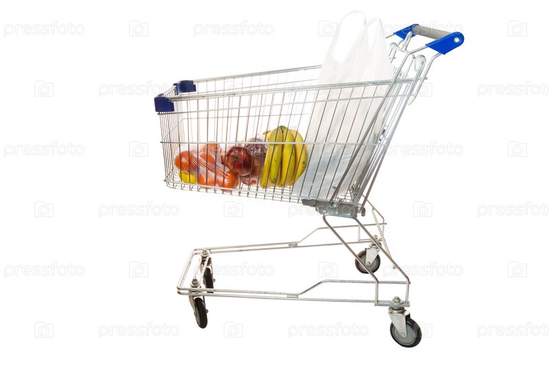 Торговая тележка с продуктами на белом фоне