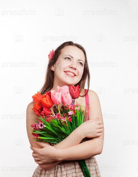 Молодая красивая девушка с букетом цветов на белом фоне