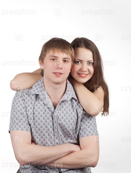 Молодая счастливая пара на белом фоне