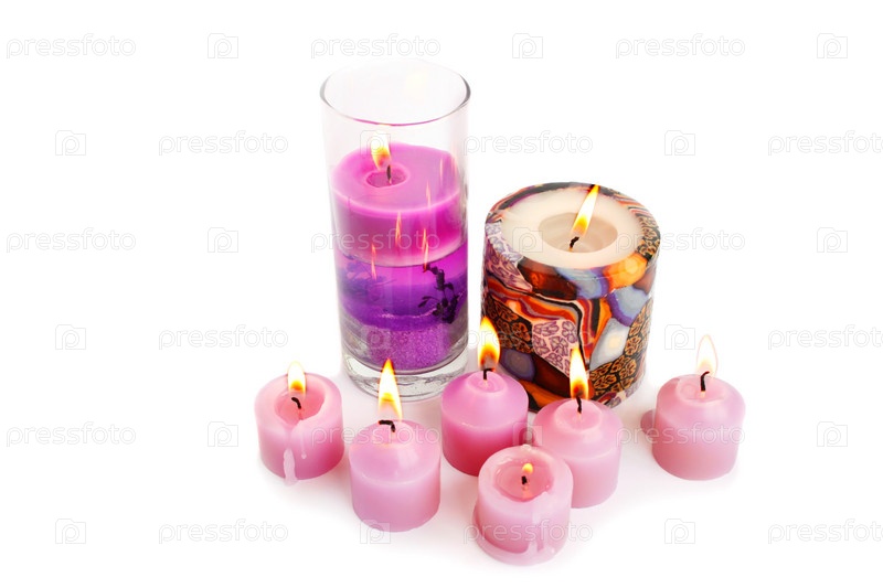 Розовые горящие свечи на белом фоне