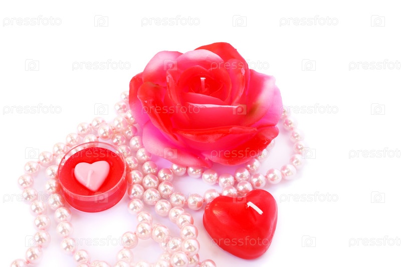 Красные свечи в форме сердец и ожерелье, изолировано на белом фоне