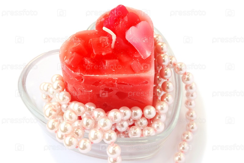 Красная свеча в форме сердца и ожерелье, изолировано на белом фоне
