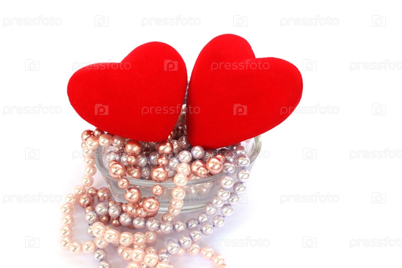 Красные сердца и колье в вазе, изолировано на белом фоне
