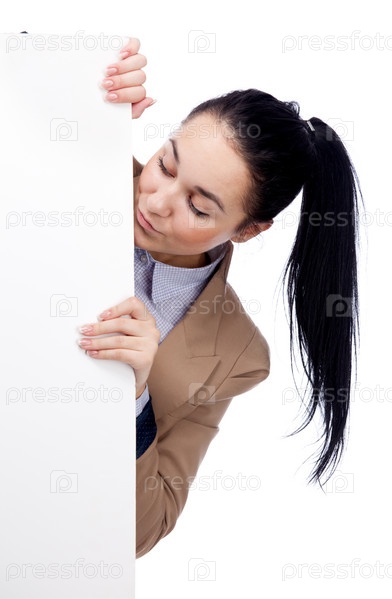 Молодая деловая леди с пустым плакатом. изолирована на белом фоне