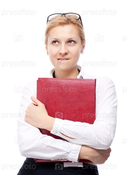 Деловая женщина с красной папкой в руках на белом фоне