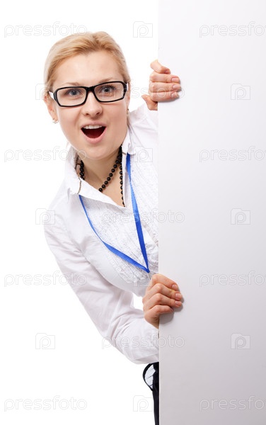 Молодая деловая женщина с пустым баннером в руках на белом фоне