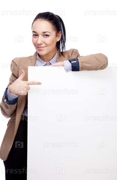 Молодая деловая женщина с пустым баннером в руках на белом фоне