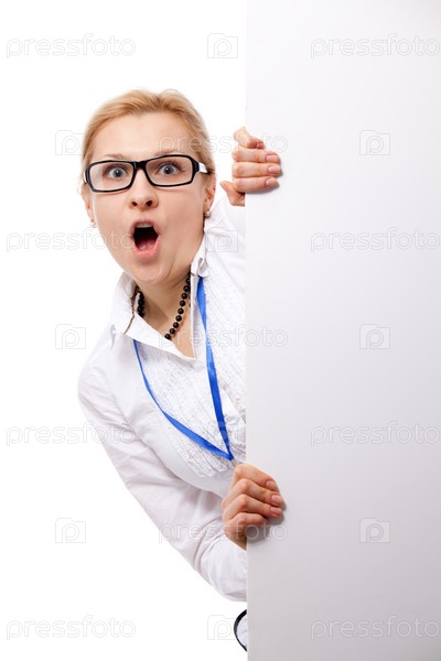 Молодая деловая женщина с пустым баннером в руках на белом фоне