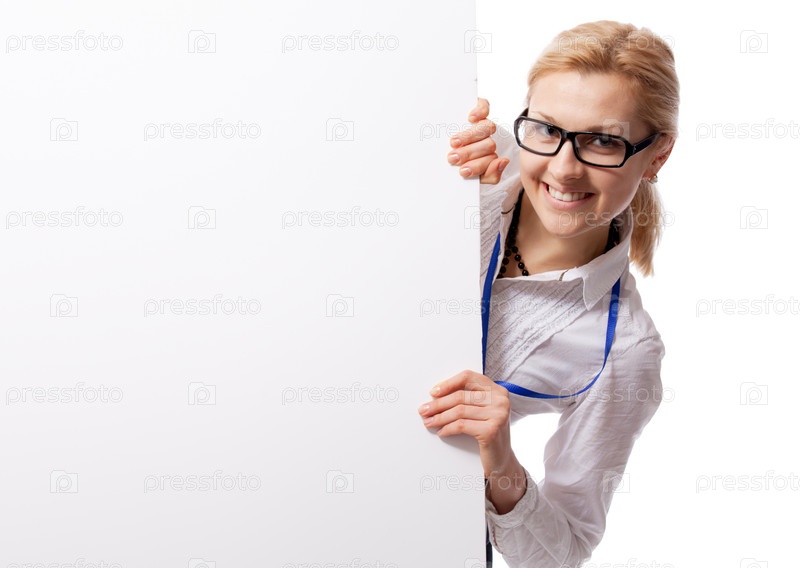 Женщина с пустым плакатом. изолирована на белом фоне