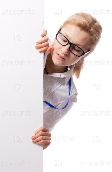 Молодая деловая леди с пустыми плакатом. изолирована на белом фоне