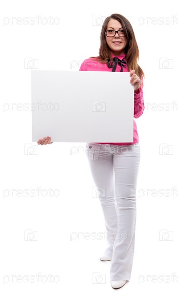 Девушка с пустым баннером на белом фоне