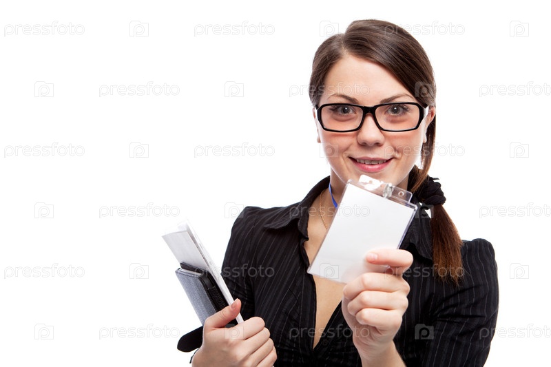 Девушка с пустым удостоверением личности на белом фоне