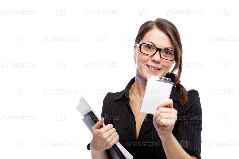 Девушка с пустым удостоверением личности на белом фоне