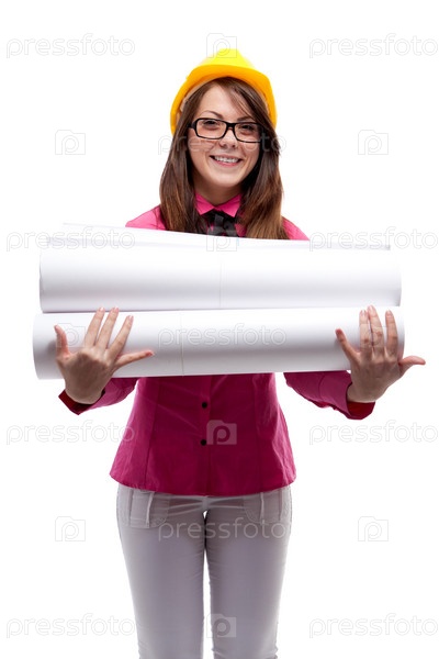Девушка с чертежами на белом фоне