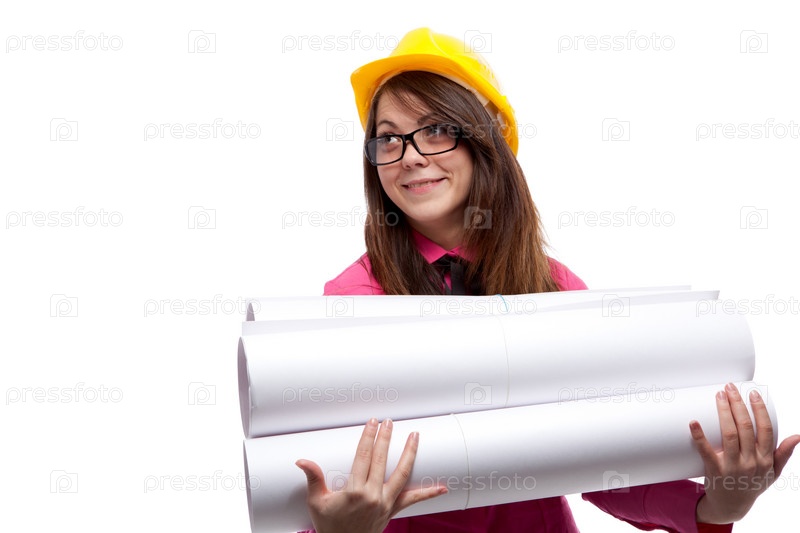 Девушка с чертежами на белом фоне
