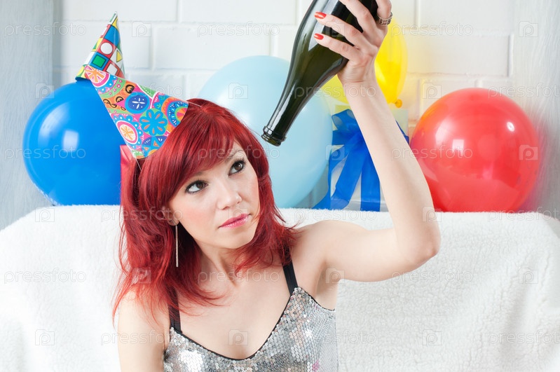 Рыжеволосая девушка в праздничном колпаке с пустой бутылкой в руке