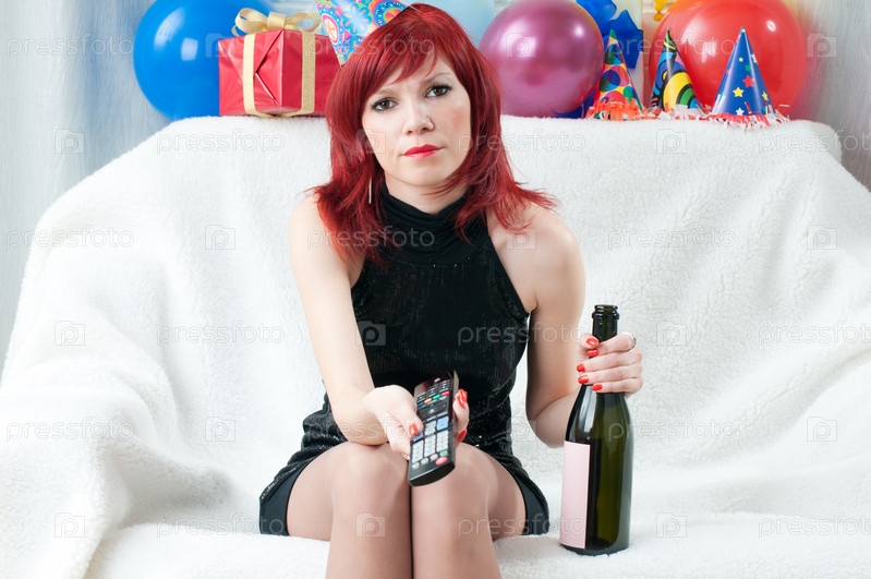 Рыжеволосая девушка в праздничном колпаке, сидящая перед телевизором с бутылкой в руке
