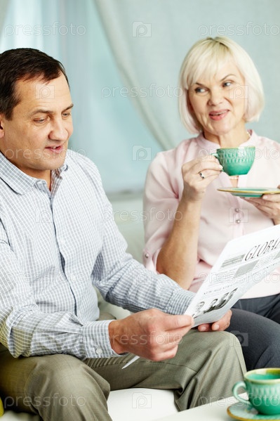 Муж читает газету во время чаепития