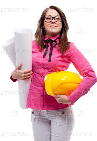 Девушка с каской и чертежами, изолирована на белом фоне