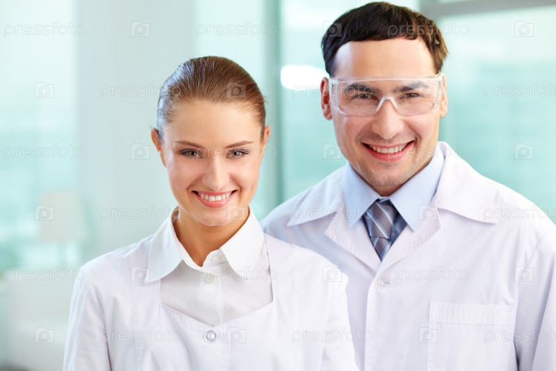 Двое ученых в белых халатах улыбаются в лаборатории