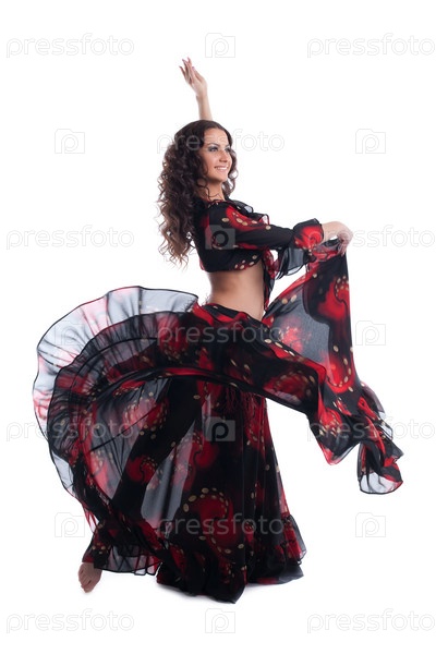 Молодая женщина танцует в цыганском костюме, изолирована на белом фоне