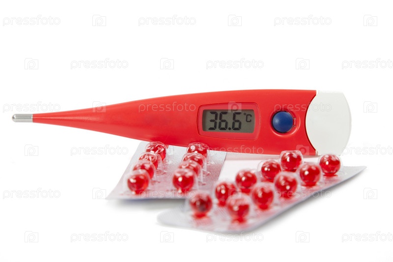 Термометр и таблетки на белом фоне