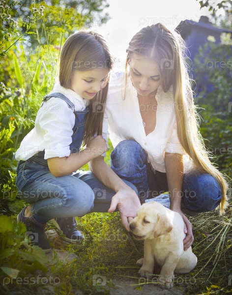 Мать и дочь играют с щенком